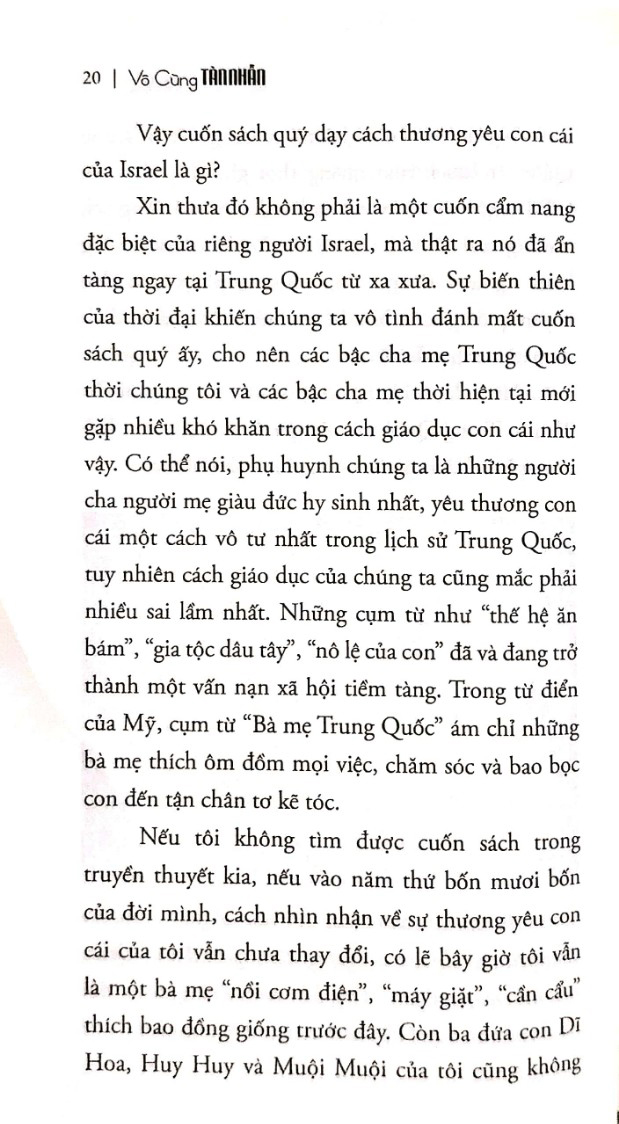 "Vô Cùng Tàn Nhẫn Vô Cùng Yêu Thương" là sự kết hợp phương pháp giáo dục con của Trung Quốc và Do Thái, dân tộc ẩn chứa nguồn sức mạnh tiềm ẩn khổng lồ. Sara Imas, tác giả cuốn sách, cho rằng: “Người nào nuông chiều con cái, ắt có ngày người đó phải băng bó vết thương cho con. Mềm mỏng là hại, tàn nhẫn là yêu!”. Bà mẹ Do Thái cũng ví von: “Cha mẹ Trung Quốc yêu thương con giống hình tử cung, còn các bậc cha mẹ Do Thái yêu thương con cái như hình đống lửa.”