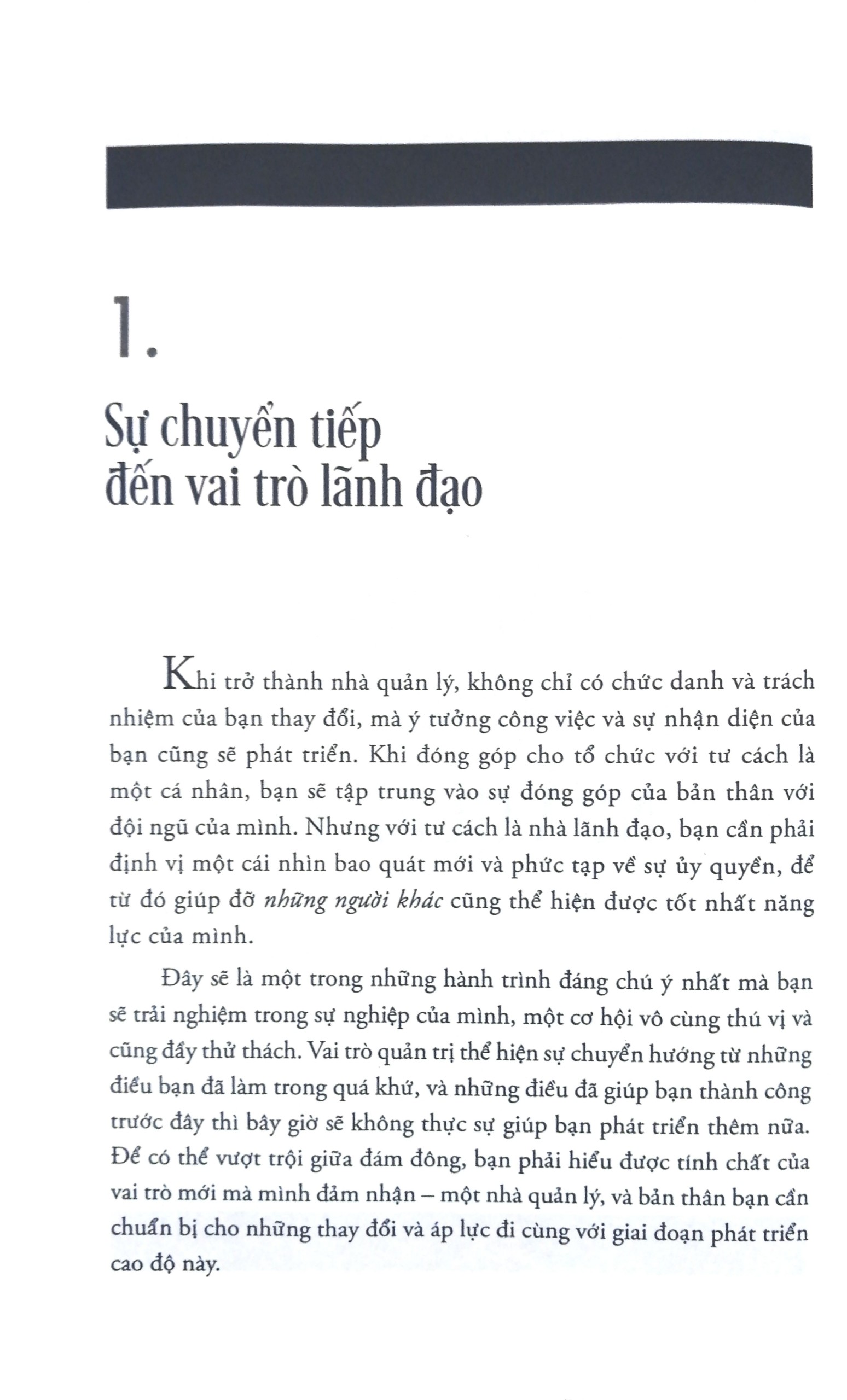 Là một nhà quản lý, bạn sẽ đo lường thành công theo một cách khác – thông qua thành quả của cả đội ngũ chứ không chỉ riêng bản thân bạn. Khi trở thành một nhà quản lý, kiến thức chuyên môn của bạn vẫn đóng vai trò quan trọng, nhưng nó không còn định nghĩa trách nhiệm của bạn nữa. Lúc này nhiệm vụ của bạn là đạt được những kết quả thông qua quá trình sáng tạo, tri thức chuyên môn và năng lượng từ nhiều người khác. Ví dụ, những kỹ năng bán hàng của bạn đã giúp bạn được thăng tiến đến vị trí quản lý bán hàng, nhưng sự thành công của bạn với tư cách là một nhà quản lý sẽ dựa vào năng lực của những người khác: khả năng tạo ra sức ảnh hưởng trong tổ chức của mình để quản lý văn hóa cảm xúc trong đội ngũ của bạn, để tuyển dụng và giữ chân những nhân viên tốt, để tạo động lực và phát triển tiềm năng của mỗi thành viên trong đội ngũ của bạn, để suy nghĩ một cách chiến lược, để đưa ra những quyết định đúng đắn, để khơi nguồn cảm hứng và thúc đẩy sự sáng tạo, cùng rất nhiều điều khác nữa.