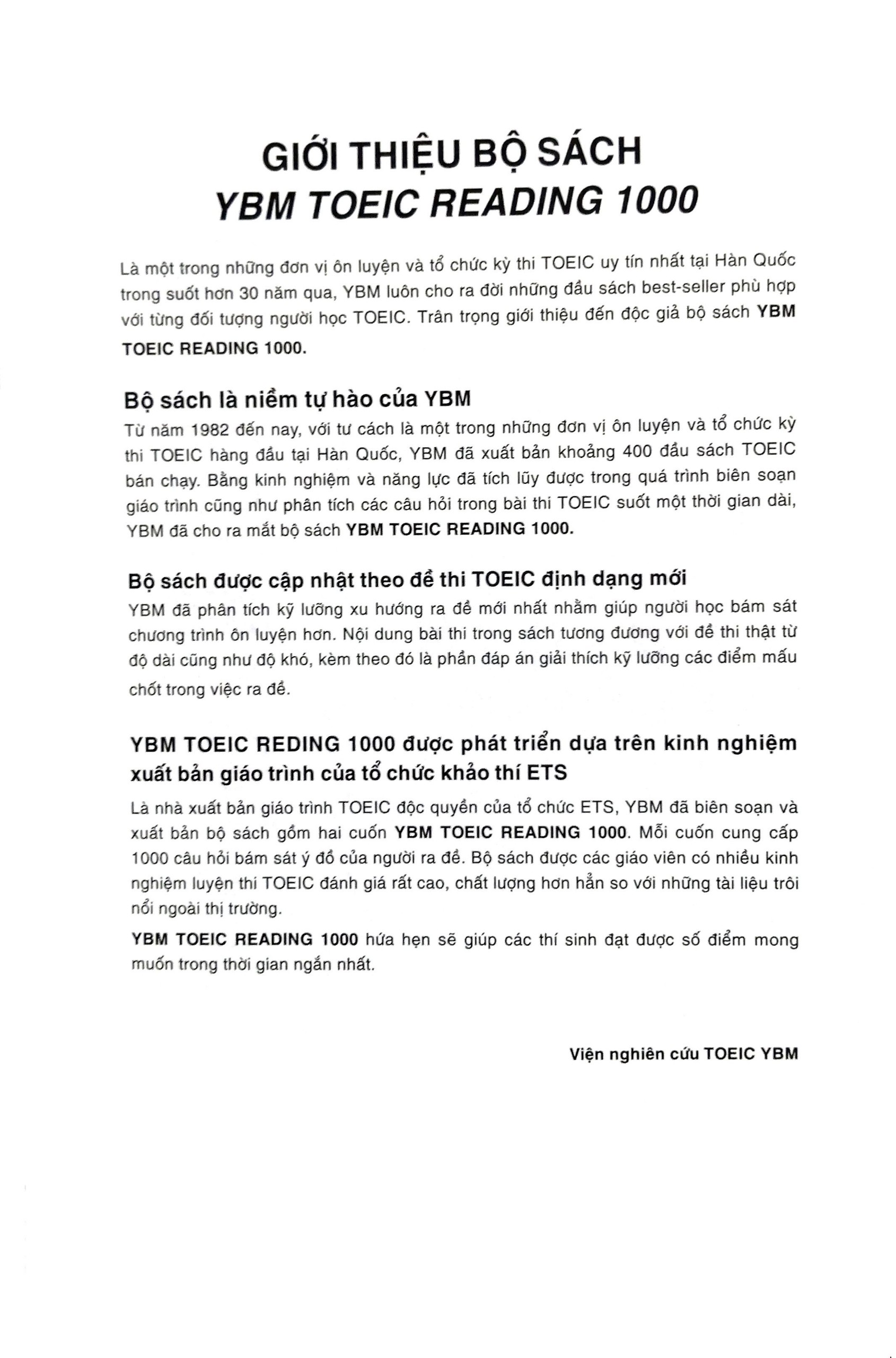 Bắt kịp xu hướng ra đề thi TOEIC theo định dạng mới, bộ sáchYBM TOEIC Reading 1000(gồm 2 cuốn) cho thấy rõ những thay đổi trong phần thi Đọc. Mỗi cuốn trong bộ sách cung cấp 1000 câu hỏi bám sát đề thi thật, được cập nhật mới nhất, phù hợp với người học thuộc các trình độ khác nhau (band 500+ và 700+). Phần giới thiệu ở những trang đầu (giải đáp thắc mắc liên quan đến kỳ thi TOEIC, phân tích xu hướng ra đề theo định dạng mới, bảng quy đổi điểm,…) tóm lược những thông tin chắt lọc và quan trọng về TOEIC. Phần phía sau cuốn sách đưa ra lời giải thích đáp án chi tiết, cho thấy điểm vượt trội của tài liệu này so với các cuốn sách luyện đề khô khan khác. Với những hướng dẫn cụ thể và rõ ràng, người học chắc chắn sẽ không còn bỡ ngỡ trước những đổi mới của bài thi TOEIC, tự tin bước vào phòng thi và chinh phục điểm số cao như kỳ vọng.