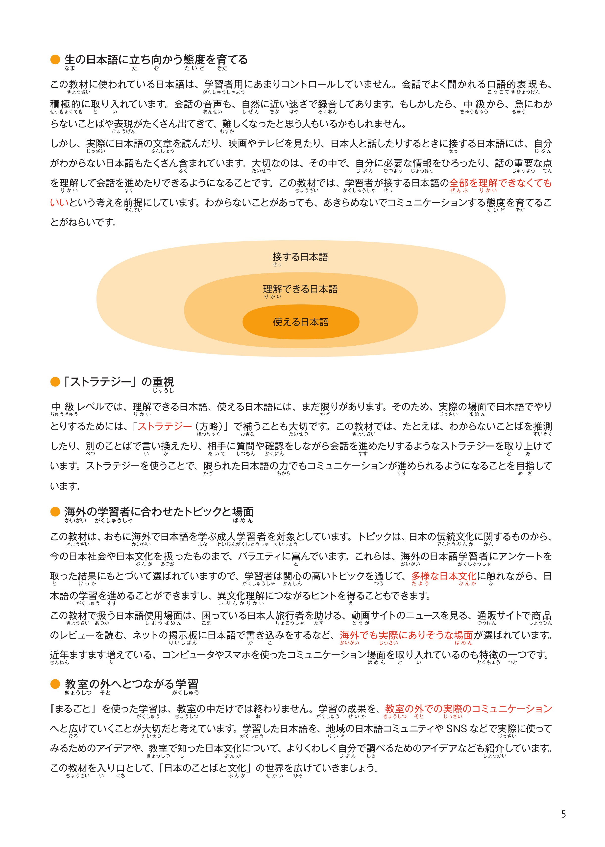 ● Đem đến cơ hội vận dụng tiếng Nhật bên ngoài lớp học: Không chỉ dừng lại trong khuôn khổ lớp học, cuốn sách đưa ra các ý tưởng để người học vận dụng tiếng Nhật đã học được vào thực tế (như cộng đồng tiếng Nhật địa phương), hay tự mình tra cứu kỹ hơn về khía cạnh văn hóa Nhật Bản đã học trên lớp.
