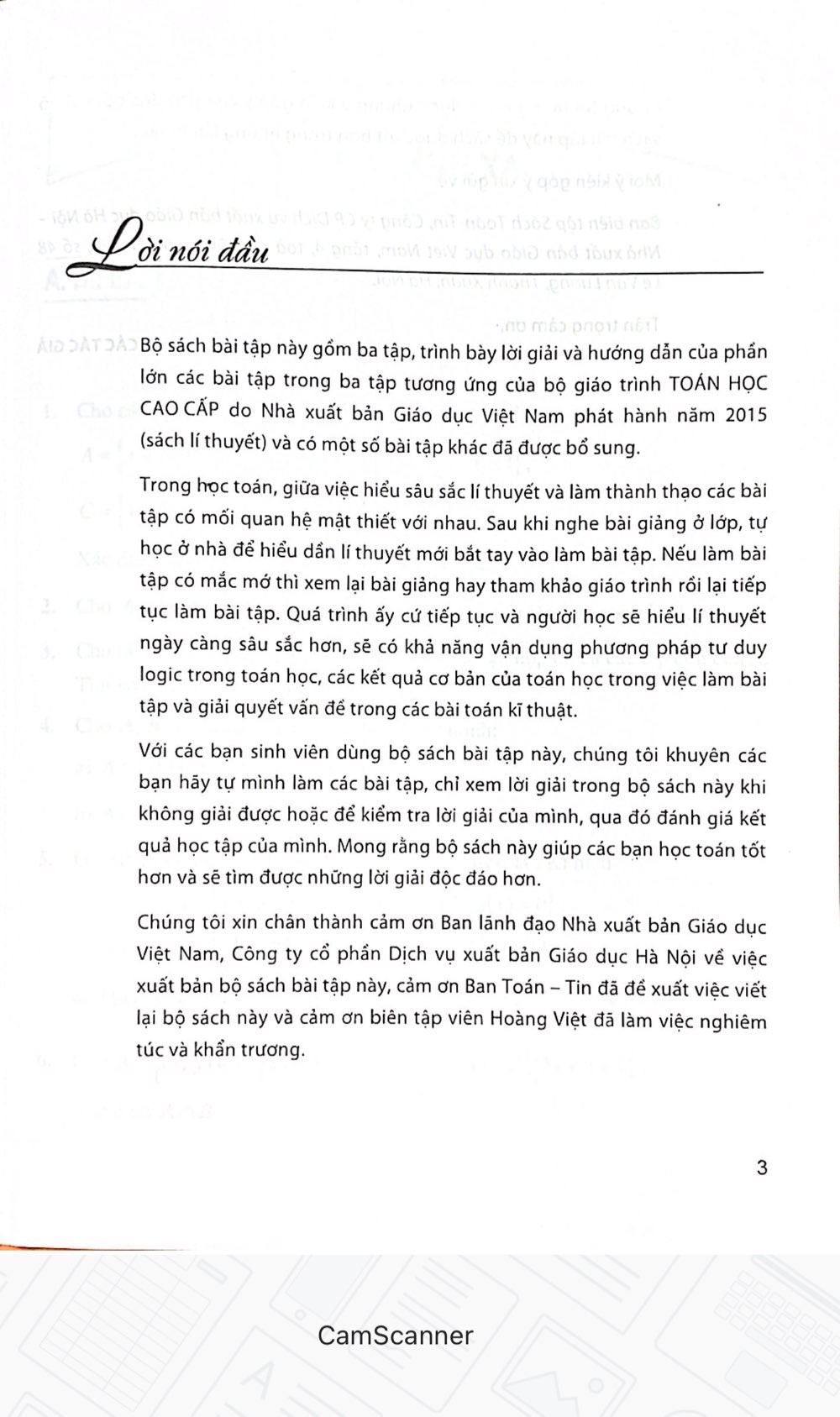 Với các bạn sinh viên dùng bộ sách bài tập này, chúng tôi khuyên các bạn hãy tự mình làm các bài tập, chỉ xem lời giải trong bộ sách này khi không giải được hoặc để kiểm tra lời giải của mình, qua đó đánh giá kết quả học tập của mình. Mong rằng bộ sách này giúp các bạn học toán tốt hơn và sẽ tìm được những lời giải độc đáo hơn.