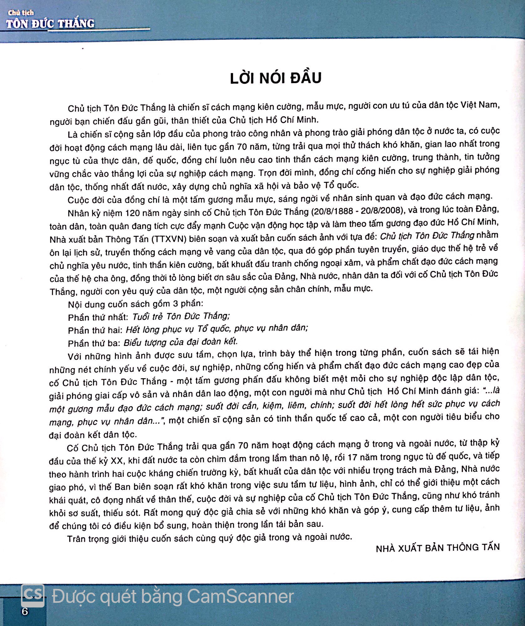 Cố Chủ tịch Tôn Đức Thắng đã trải qua gần 70 năm hoạt động cách mạng trong và ngoài nước, từ những thập kỷ đầu thế kỷ XX, khi đất nước ta còn chìm đắm trong lầm than nô lệ, rồi 17 năm trong ngục tù đế quốc và tiếp theo hành trình hai cuộc kháng chiến trường kỳ, bất khuất của dân tộc với nhiều trọng trách mà Đảng, Nhà nước giao phó. Vì thế Ban biên soạn đã rất khó khăn trong việc sưu tầm tư liệu, hình ảnh, chỉ có thể giới thiệu một cách khái quát, cô động nhất về thân thế, cuộc đời. và sự nghiệp của cố Chủ tịch Tôn Đức Thắng cũng như không thể tránh khỏi những sơ suất, thiếu sót. Kính mong bạn đọc chia sẻ những khó khăn và góp ý, cung cấp thêm tài liệu, ảnh để chúng tôi có điều kiện bổ sung, hoàn thiện trong lần tái bản sau.