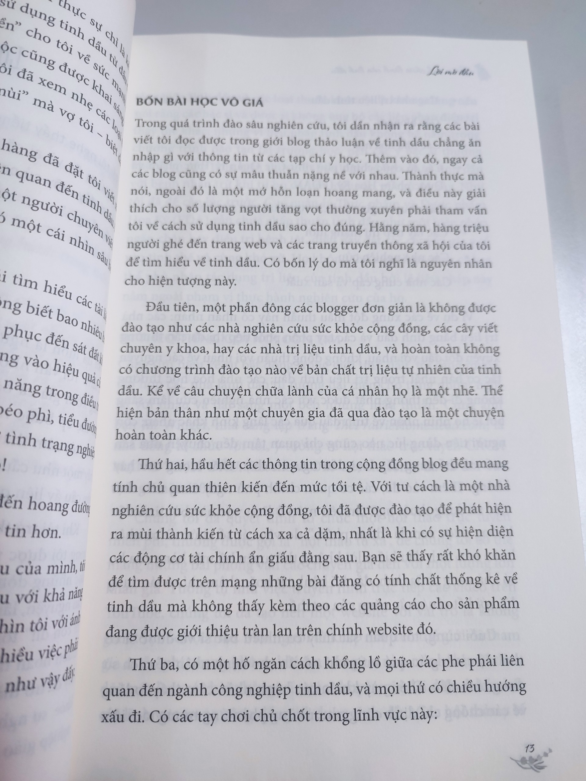 Tác giả không hề sa vào cái bẫy “cuồng tinh dầu”. Ông nhận thức và trình bày rất rõ ràng về những mặt trái của việc dùng tinh dầu sai cách. “Sai” ở đây không chỉ là sai về công thức pha chế, mà đặc biệt quan trọng, sai với một cá nhân cụ thể. Xuyên suốt cả cuốn sách, tác giả liên tục nhắc nhở người dùng phải chú ý quan sát chính mình, người thân, thú cưng,… để điều chỉnh các công thức cho phù hợp nhất với cơ thể và hoàn cảnh từng người. Ông luôn khuyên mọi người tìm hiểu và sử dụng tinh dầu của những loại cây phát triển trên chính mảnh đất quê hương họ, những thảo dược ấy chắc chắn phù hợp với người dân địa phương hơn các nguyên liệu từ xa đến.