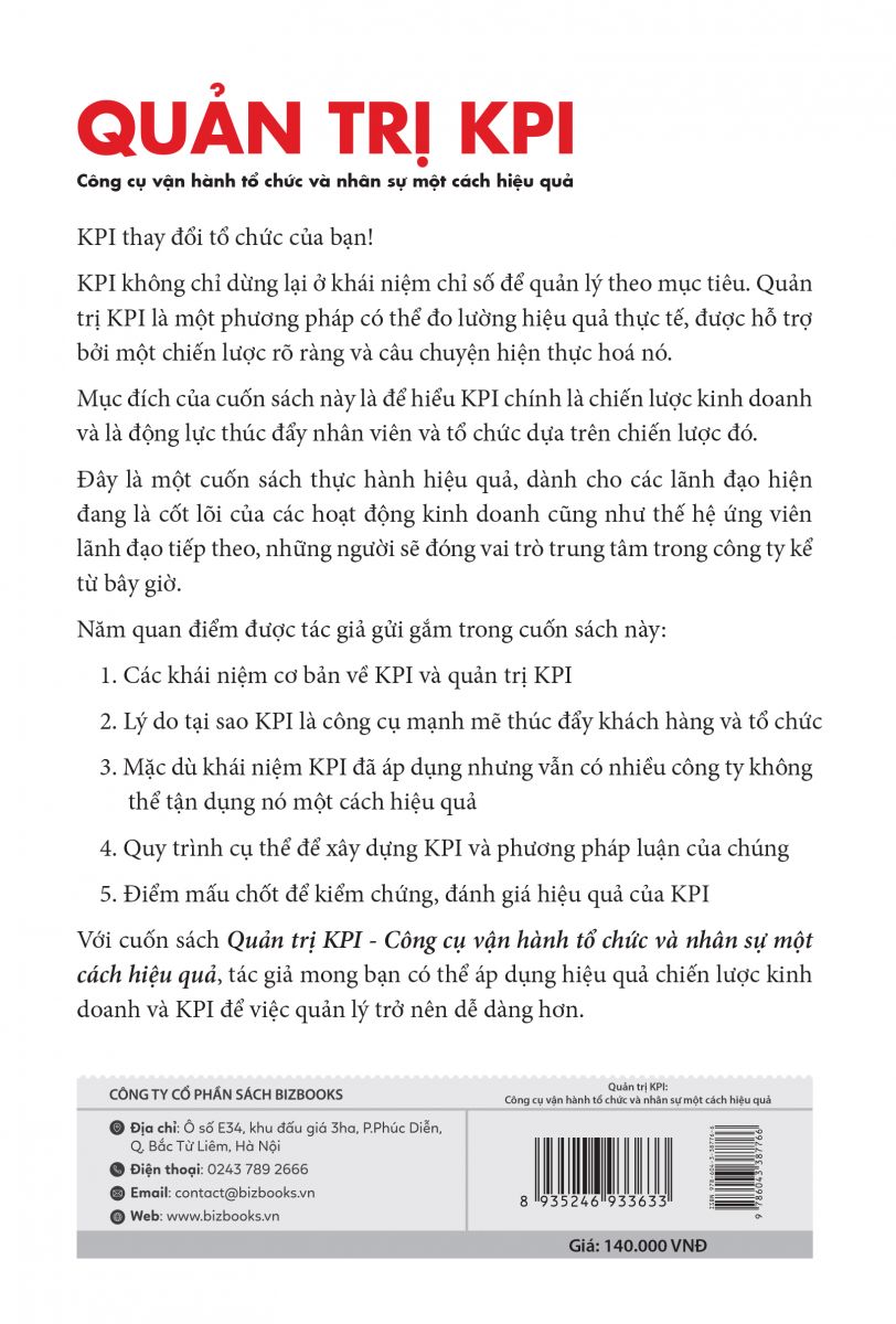 Quản trị KPI không đơn thuần chỉ là phương pháp giúp ban lãnh đạo nắm bắt biến động trong thành tích kinh doanh mà còn là “động lực học thúc đẩy tổ chức”. Sở hữu ngay cuốn sách này chắc chắn sẽ giúp các nhà quản trị áp dụng hiệu quả chiến lược kinh doanh và KPI để việc quản lý trở nên dễ dàng hơn, đưa vị thế công ty vươn xa trong thương trường và tạo nên những bước nhảy vọt trong việc phát triển doanh nghiệp. Đặc biệt, “Quản trị KPI” còn hỗ trợ App nghe miễn phí và nhận ngay Audiobooks khi mua sách giấy qua các nền tảng trực tuyến của công ty Bizbooks.