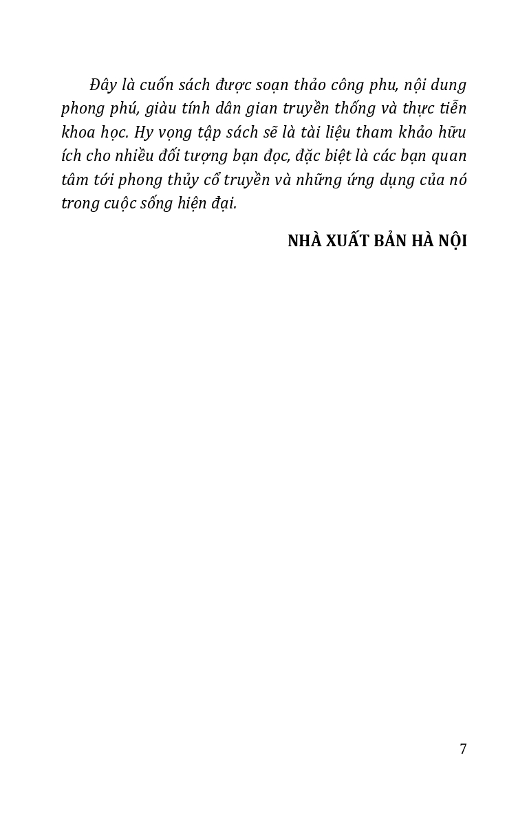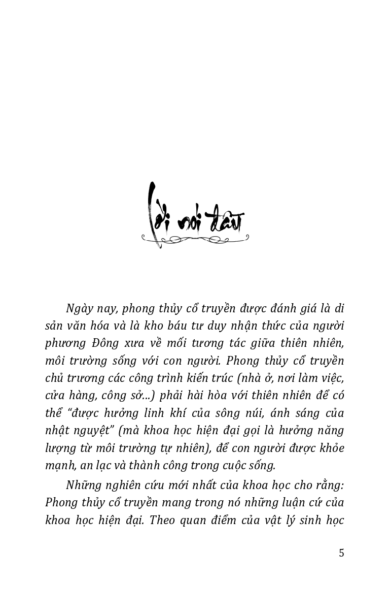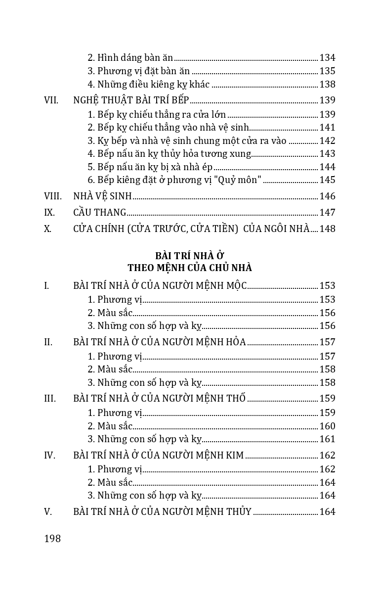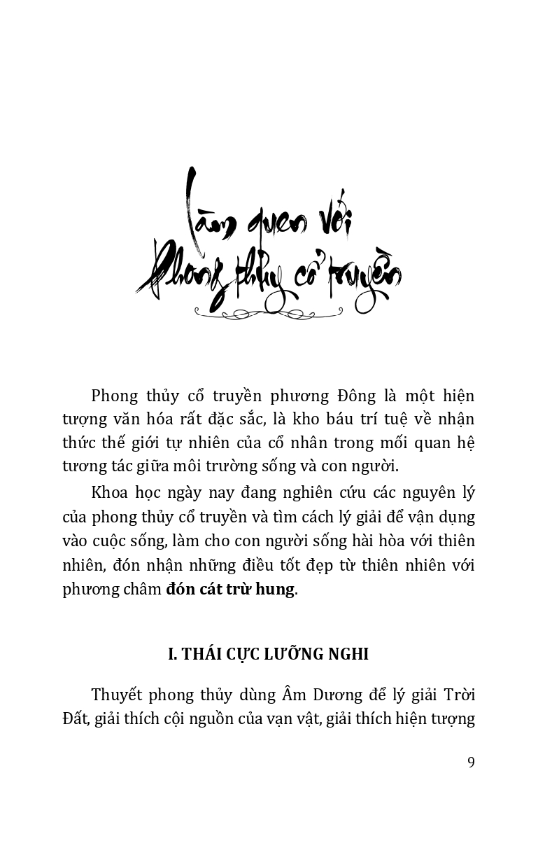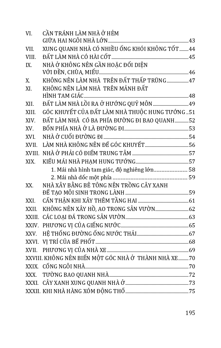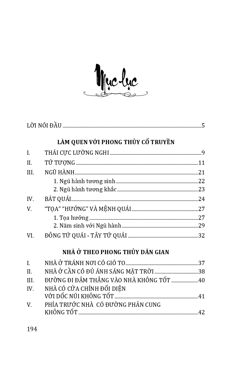 | Trình bày những vấn đề về phong thủy cổ truyền: cách xem nhà theo quan điểm dân gian; cách phá giải nhà ở theo phong tục dân gian; bài trí nhà ở theo phong tục dân gian để đón cát, trừ hung; cách bài trí nhà ở theo mệnh của chủ nhà; chọ màu sắc theo phong tục dân gian. |