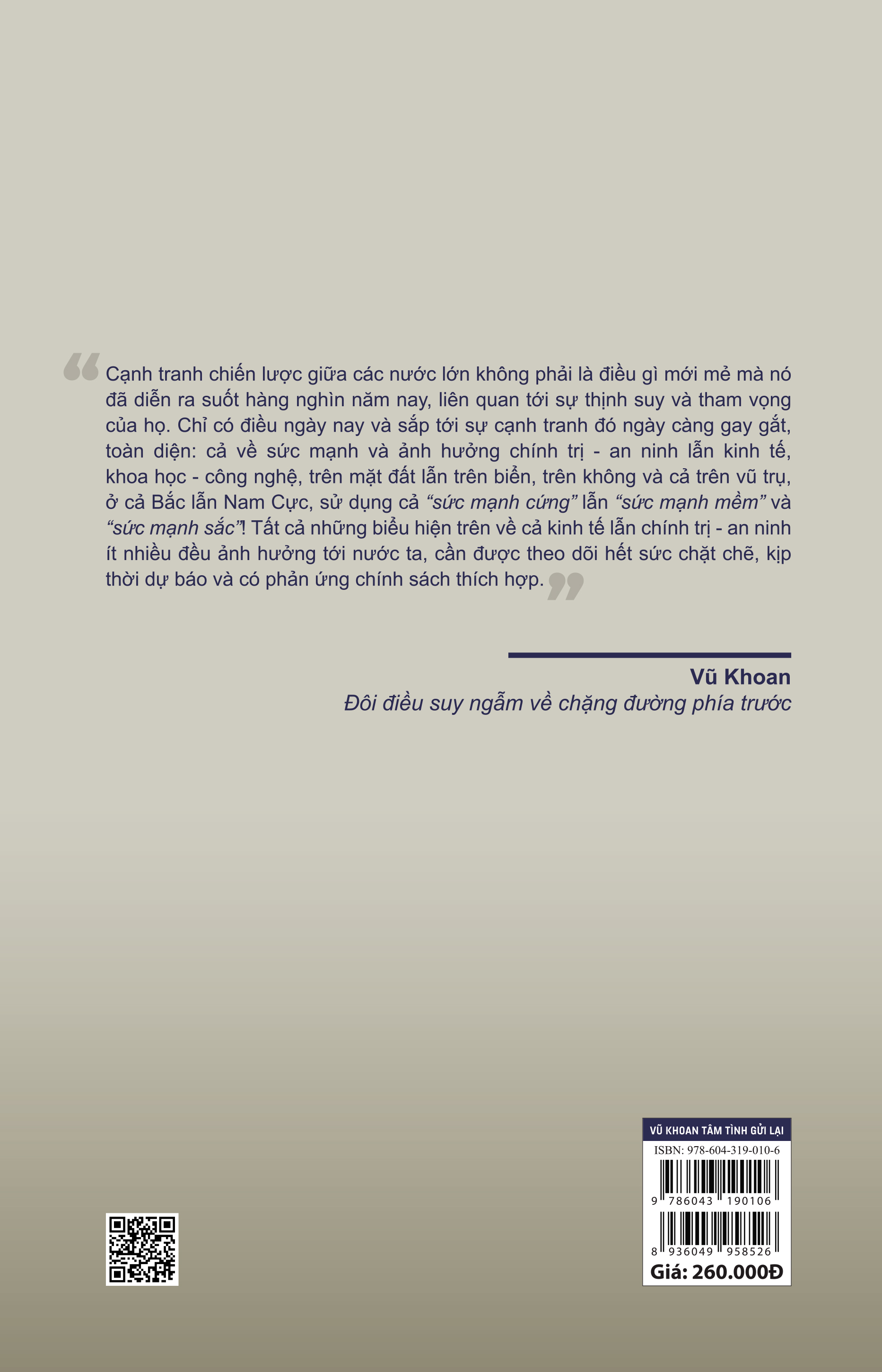 Xin trân trọng giới thiệu Vũ Khoan – tâm tình gửi lại với mong muốn chuyển đến bạn đọc những tác phẩm báo chí tâm huyết để khi lật từng trang sách ta không chỉ có thể cảm nhận hơi thở nóng hổi của thời cuộc mà còn như thấy hiển hiện chân dung của một nhà lãnh đạo có tầm nhìn chiến lược, một nhà ngoại giao tài ba, một cây bút sắc sảo, một người bạn lớn chân thành và gần gũi: ông Vũ Khoan.
