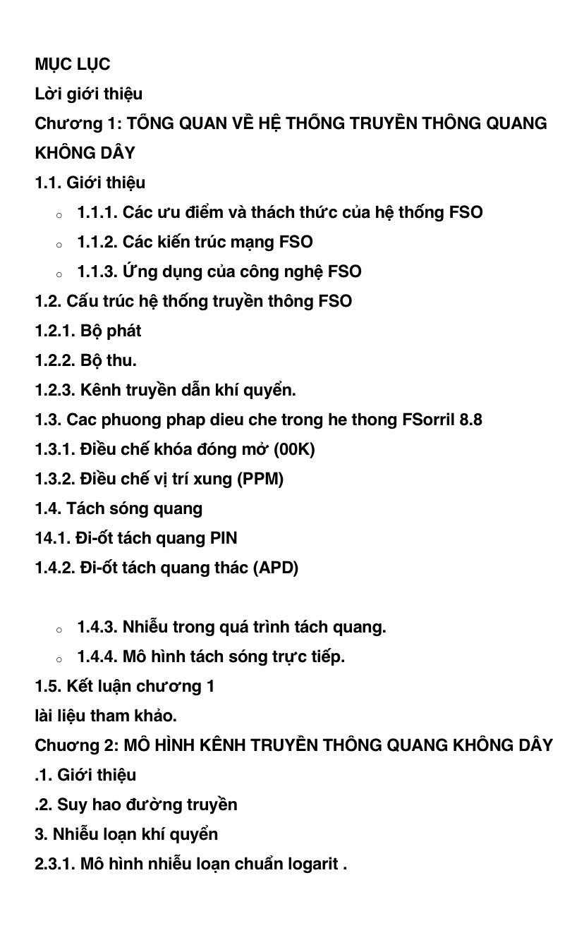 Truyền thông quang không dây (FSO) là công nghệ tiên tiến cho phép truyền số liệu với tốc độ cao nhờ ánh sáng qua môi trường không khí thay vì qua sợi quang. FSO đặ biệt có lợi thế ở các khu vực đô thị, nơi việc lắp đặt cáp quang khó khăn và tốn kém. Đây cũng là giải pháp linh hoạt cho các kết nối tạm thời hoặc tình huống phục hồi sau thảm họa. Tuy nhiện, truyền thông quang không dây đòi hỏi phải có đường truyền tầm nhìn thẳng giữa đầu phát và đầu thu và có thể bị ảnh hưởng bởi các điều kiện khí quyển như : sương mù, mưa lớn và đặc biệt là nhiều loạn khí quyển