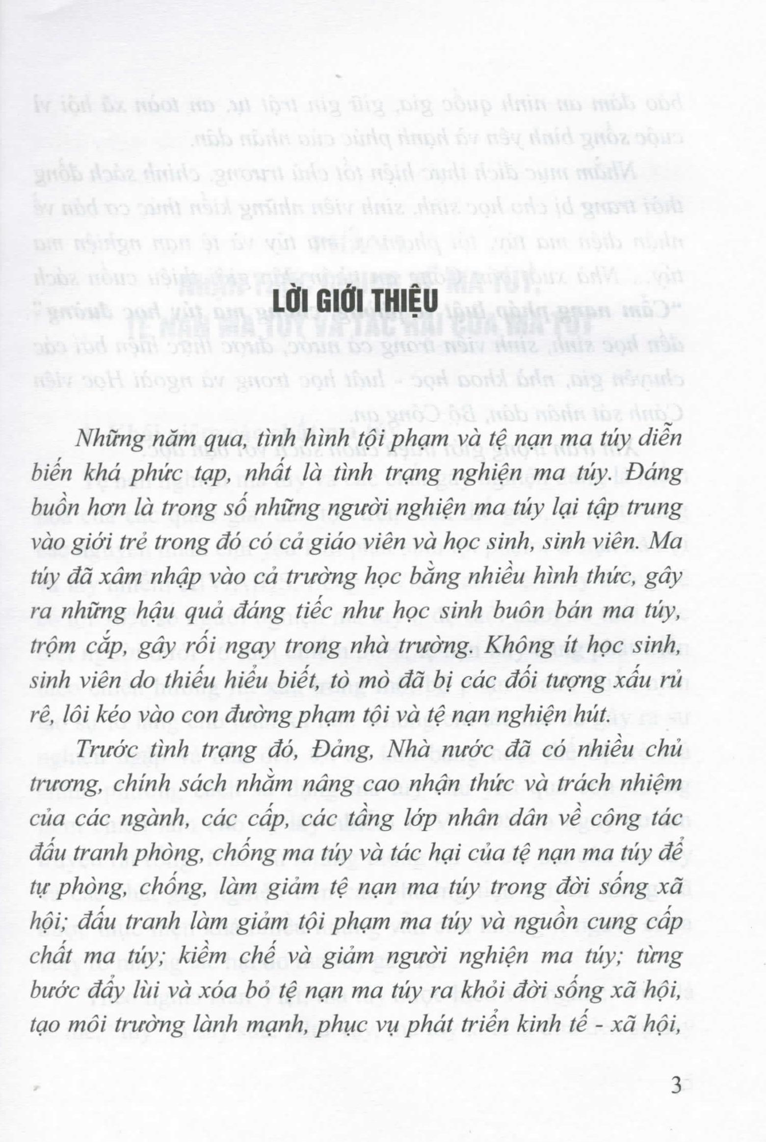 đấu tranh phòng, chống ma túy và tác hại của tệ nạn ma túy để tự phòng, chống, làm giảm tệ nạn ma túy trong đời sống xã hội; đấu tranh làm giảm tội phạm ma túy và nguồn cung cấp chất ma túy; kiềm chế và giảm người nghiện ma túy; từng bước đẩy lùi và xóa bỏ tệ nạn ma túy ra khỏi đời sống xã hội, tạo môi trường lành mạnh, phục vụ phát triển kinh tế - xã hội, bảo đảm an ninh quốc gia, giữ gìn trật tự, an toàn xã hội vì cuộc sống bình yên và hạnh phúc của nhân dân. Nhằm mục đích thực hiện tốt chủ trương, chính sách đồng thời trang bị cho học sinh, sinh viên những kiến thức cơ bản về nhận diện ma túy, tội phạm về ma túy và tệ nạn nghiện ma túy… Nhà xuất bản Công an nhân dân giới thiệu cuốn sách “Cẩm nang pháp luật về phòng, chống ma túy học đường” đến học sinh, sinh viên trong cả nước, được thực hiện bởi các chuyên gia, nhà khoa học - luật học trong và ngoài Học viện Cảnh sát nhân dân, Bộ Công an. Xin trân trọng giới thiệu cuốn sách với bạn đọc!