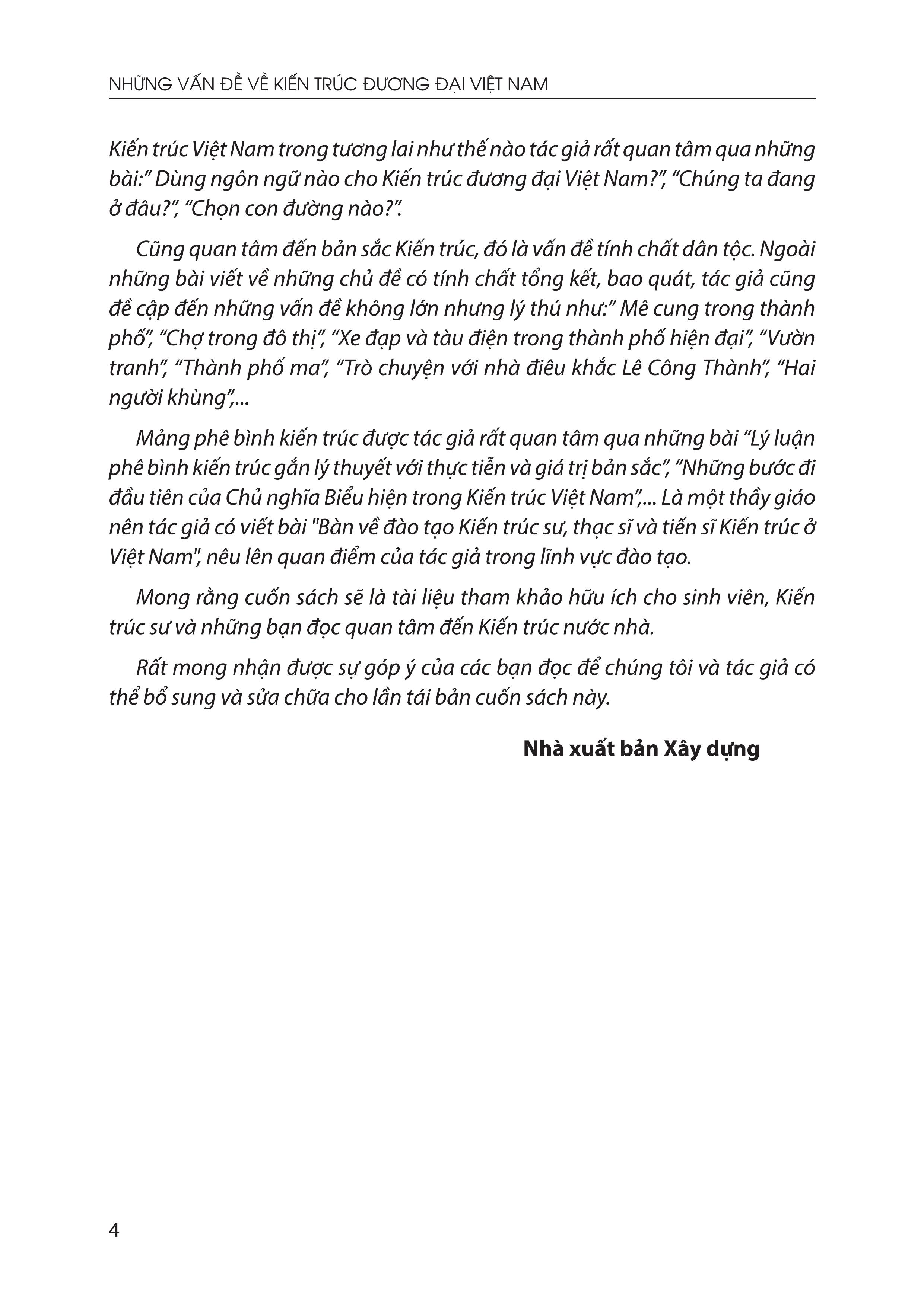 Mong rằng cuốn sách sẽ là tài liệu tham khảo hữu ích cho sinh viên, Kiến trúc sư và những bạn đọc quan tâm đến Kiến trúc nước nhà.