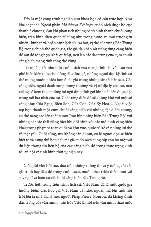 Cuốn sách “Các thương cảng ven biển Bắc Trung Bộ thế kỷ X - XIX” của tác giả Nguyễn Văn Chuyên được phát triển từ luận án Tiến sĩ Sử học của chính tác giả, bảo vệ tại Trường Đại học Khoa học Xã hội và Nhân văn, Đại học Quốc gia Hà Nội vào năm 2018. Luận án có tầm cỡ một công trình nghiên cứu chuyên sâu không chỉ có ý nghĩa khoa học mà còn thiết thực đóng góp vào công cuộc nghiên cứu phục vụ sự nghiệp phát triển kinh tế - xã hội và an ninh vùng Bắc Trung Bộ của Tổ quốc.
